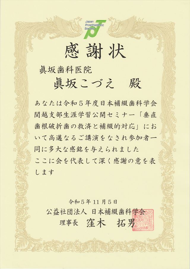 2023年11月5日に行われた日本補綴歯科学会関越支部学術大会生涯学習公開セミナーで、眞坂こづえ副院長が 講演を行いました。
